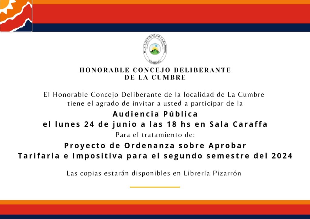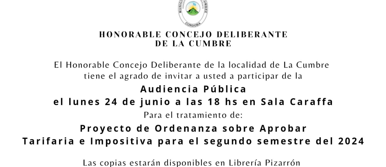 Convocatoria a Audiencia Pública proyecto de Ordenanza Tarifaria e Impositiva, segundo semestre 2024.